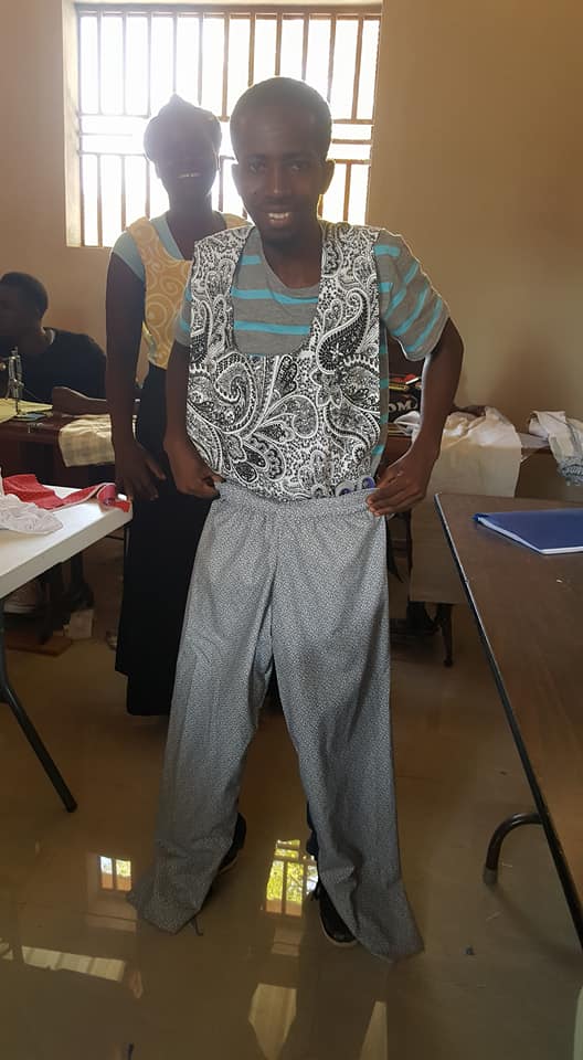 After some of the basic patterns, the teachers taught the students how to make backpacks and purses (big shoulder bags) which they made as many as the could for family and friends. Part of the purpose is to give the young ladies a means to produce an income. The third day, the students had advanced so far, so quickly, that Carol had to pull out patterns for shirts, blouses, pants and dresses. One of the young ladies made a long casual dress that could be used for church. As you can see, Simon was a model!